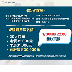 🐾 破解貓下泌尿治療困境,提升診斷與手術技術! 💥 2025年最值得期待的獸醫專業課程—— 「貓尿道造口手術實作」 即將登場! 📣 面對這些挑戰,你是否也曾苦惱? 💡排尿困難找不到原因嗎? 這堂課將教會你,貓下泌尿道外科疾病的診斷能力 💡排尿困難一定要手術嗎? 讓專家告訴你,泌尿問題手術介入治療的時機 💡造口又狹窄了該怎麼辦? 掌握尿道阻塞手術的核心技術 🐾 讓你的技能更上一層樓,你能改變🐈病患的未來! 📅 課程資訊 時間:2025 年 5 月 2 日(五) 地點:高雄梅西動物醫療中心 主辦單位:萊森獸醫實作教育中心 協辦單位:高雄市福爾摩沙獸醫臨床醫學會 贊助廠商:京鉅科技 課程費用: -原定價格 32,000元 -早鳥優惠 31,000元 -預報優惠 30,000元 課程名額:16 人開班,20 人額滿! ⚠️ 限時特惠,錯過恢復原價! ⚠️ 名額有限,錯過再等一年! ⏰ 預報時間:2025/1/30 22:00 開放報名!